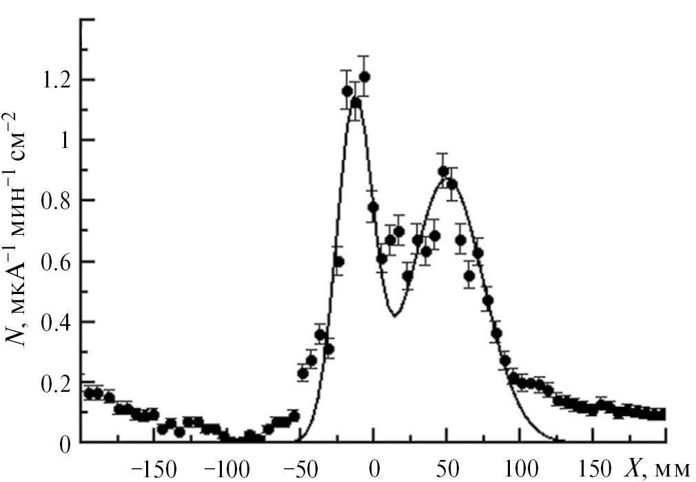 Рис. 3. Распределение тепловых нейтронов с En < 0.55 эВ, измеренное на расстоянии 204 см от центра мишени из 9Be позиционно-чувствительным детектором на основе 10B. Кривая — аппроксимация двумя гауссианами.