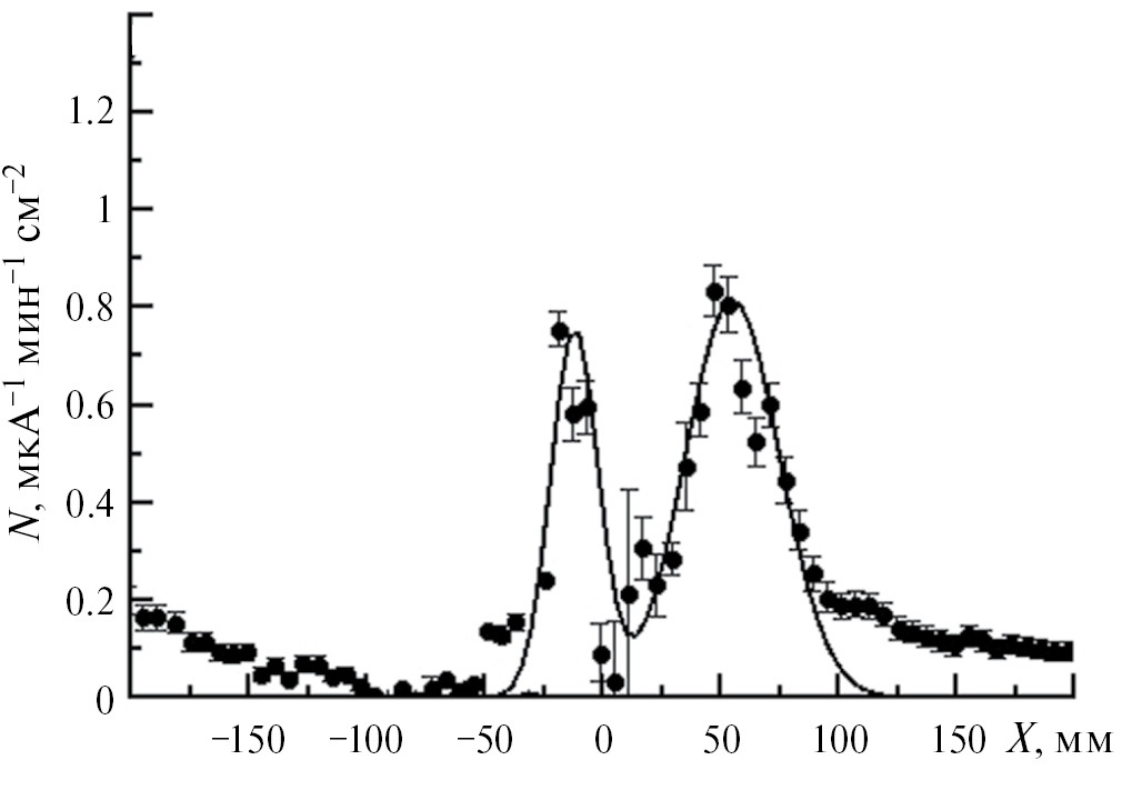 Рис. 4. Распределение тепловых нейтронов с En < 0.55 эВ, измеренное на расстоянии 204 см от центра мишени из 9Be перемещаемым счетчиком на основе 3He. Кривая — аппроксимация двумя гауссианами и равномерным фоном.
