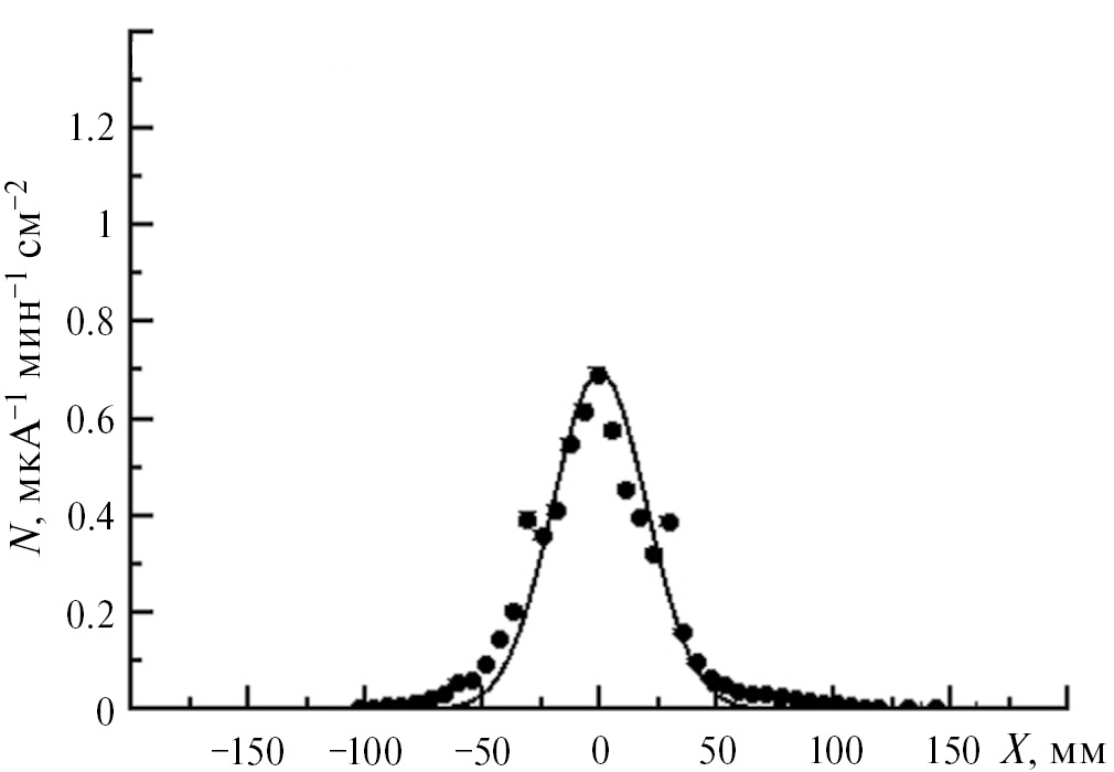 На рис. 1 показано экспериментальное распределение нейтронов вдоль горизонтальной оси, измеренное 10B-детектором в отсутствии кадмиевого фильтра. Он располагался на расстоянии 204 см от центра мишени. На рис. 2 показано экспериментальное распределение нейтронов, измеренное с помощью ПЧДН с кадмиевым фильтром перед ним. Его граничная энергия составляет около 0.55 эВ, то есть он задерживает тепловые нейтроны. На рис. 3 показано измеренное с помощью ПЧДН экспериментальное распределение нейтронов, которое соответствует разности между потоком нейтронов всех энергий и потоком нейтронов только промежуточных энергий. Поэтому это есть распределение только тепловых нейтронов с энергией ниже 0.55 эВ. Одновременно с измерением распределения нейтронов с помощью ПЧДН распределение нейтронов измерялось и с помощью перемещаемого механически вдоль горизонтальной плоскости 3He-счетчика. При установленном кадмиевом фильтре 3He-счетчик, который располагался позади ПЧДН, почти не регистрировал нейтронов. Это связано с тем, что эффективность 3He-счетчика для промежуточных и быстрых нейтронов очень мала. В эксперименте записывалась осциллограмма сигналов, вместе с которыми записывалось геометрическое положение счетчика. Из осциллограммы принимались в рассмотрение только тепловые нейтроны с энергией менее 0.5 эВ. На рис. 4 показано измеренное с помощью перемещаемого 3He-счетчика экспериментальное распределение нейтронов. Распределение потока нейтронов, измеренное с помощью ПЧДН и 3He-счетчика, находилось в согласии друг с другом с учетом различного пространственного разрешения.