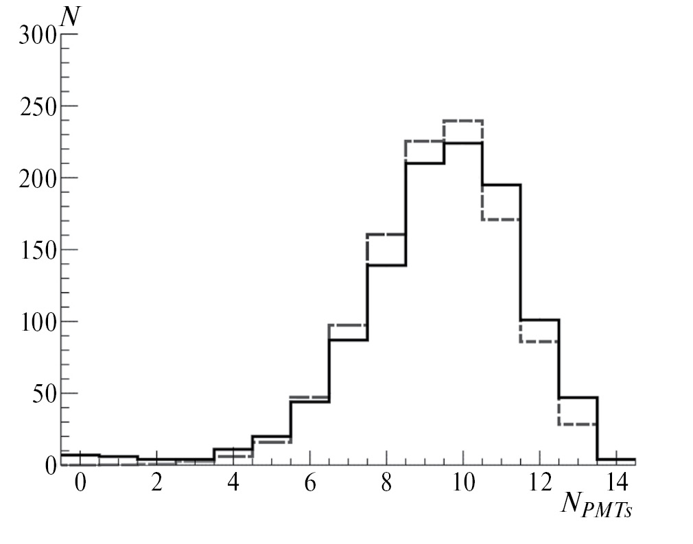 В качестве примера на рис. 3 приведен полученный результат использования описанной установки для исследования работы черенковского порогового детектора. Приведено измеренное распределение числа сработавших ФЭУ R329-02 в составе сборок Hamamatsu H6410 из 14 установленных. Эффективность ЧПД зависит от ряда факторов: его размеров, установленных порогов, принятого минимального числа сработавших ФЭУ и др. С практической точки зрения, наиболее удобной величиной, характеризующей детектирование черенковского излучения, является число сработавших ФЭУ. В нашем случае среднее число сработавших ФЭУ было равно 9.5. Если считать, что акт регистрации — это срабатывание трех или более ФЭУ, то эффективность ЧПД составляет (0.992 ± 0.003) при наборе статистики за одну неделю. Систематическая ошибка определения эффективности может возникать из-за различия свойств гигроскопичного аэрогеля в селекторе и в ЧПД, что в принципе могло бы быть из-за разгерметизации упаковки аэрогеля. Однако герметизация аэрогеля — несложная задача, и в нашем случае нет оснований считать, что свойства аэрогеля в ЧПД и в селекторе существенно отличаются друг от друга, поскольку они были изготовлены, хранились и эксплуатировались в течение короткого отрезка времени практически в одних и тех же условиях.