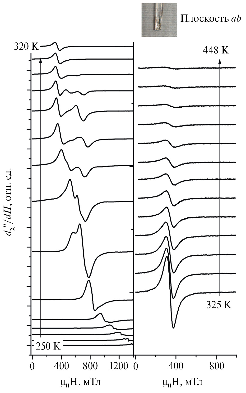 Измерены спектры ЭСР при изменении температуры от 250 K и до 448 K. Положение кристалла относительно внешнего поля было выбран таким образом, что линия спектра ЭСР находилась в самых низких полях, предположительно данное направление соответствует направлению оси a. Эволюция линии спектра ЭСР при изменении температуры представлена на рис. 5. Спектр возможно было зарегистрировать при температуре 250 К в высоких полях (1.4 Тл). При увеличении температуры линия смещалась к низким полям (330 мТл), а интенсивность линии росла и максимум достигает при температуре 320 К, далее интенсивность убывает обратно пропорционально температуре. При температуре 280 К в спектре отчетливо видно две линии, которые проявлялись при комнатной температуре и имеют угловую зависимость. При повышении температуры линии стремятся к резонансному полю около 330 мТл и совпадают. Далее линия ЭСР ведет себя как одиночная линия.