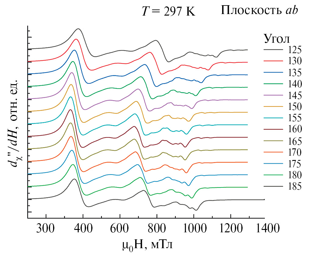 Рис. 8. Подробное рассмотрение угловой зависимости спектров ЭСР для Fe1.1Ga0.9O3 при комнатной температуре (297 К) в плоскости ab.