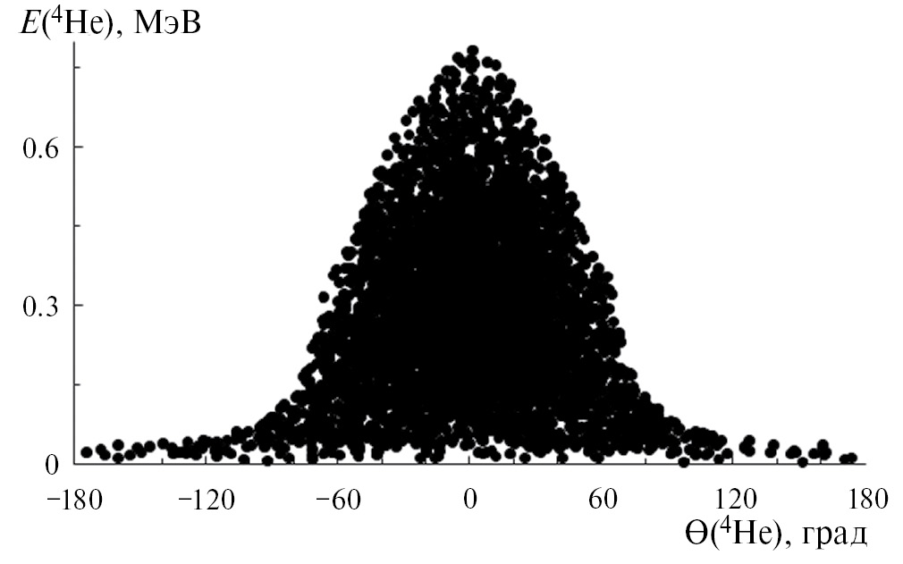 Рис. 2. Энергетическое и угловое распределения a-частиц из фоновой реакции n + 9Be → a + a + n + n при энергии нейтронов 3 МэВ.