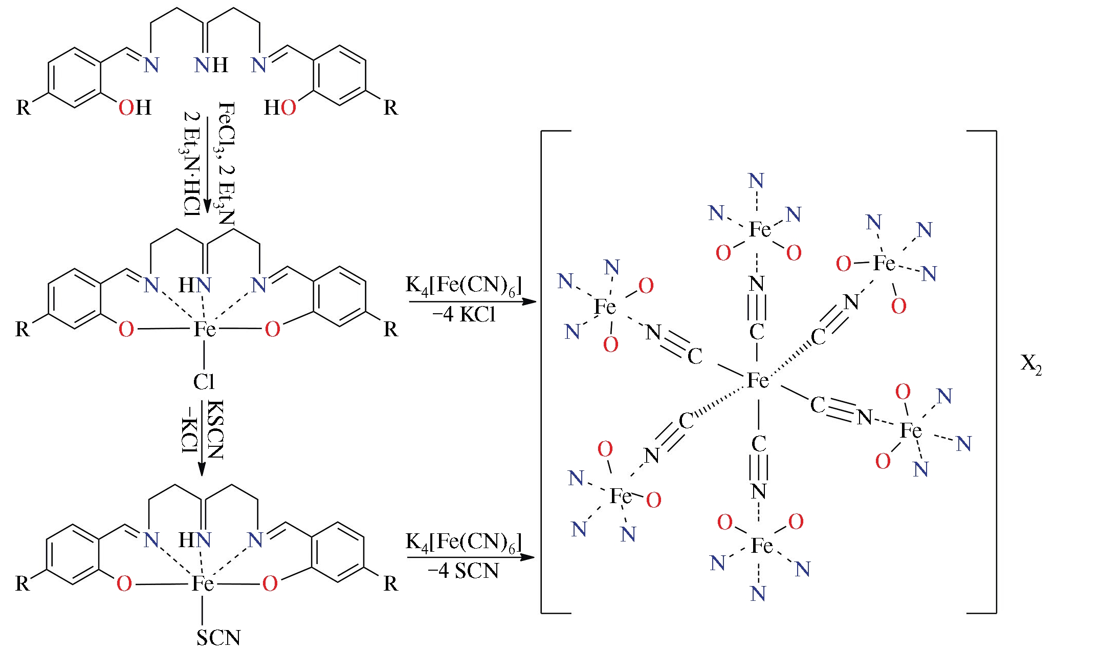 Синтез комплексов показан на рис. 1. Незамещенные лиганд и прекурсор были получены по методике [15], алкоксизамещенные лиганд и прекурсор по методике [14]. Гептаядерные комплексы Fe(II)-Fe(III) железа состава [Fe(II)(CN)6{Fe(III)(L)}6]X2, где L = дианион N, N´-бис[(2-гидроксифенил)метилен]-4-азагептан-1,7-диамина (Salten), X = Cl (1), L = Salten, X = NCS (2), L = дианион N, N´-бис[(4-октадецилокси-2-гидроксифенил)метилен]-4-азагептан-1,7-диамина (18 Salten), X = Cl (3) получены в виде порошков по методике [16]. Состав комплексов подтвержден данными элементного анализа.