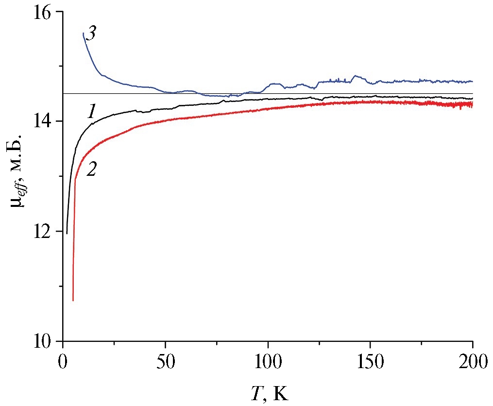 При T > 100 K энергия теплового движения больше, чем энергия обменных магнитных взаимодействий; соответственно, комплексы можно считать классическими парамагнетиками, а их экспериментальные значения μeff примерно соответствуют теоретическому. Комплекс 1 был синтезирован и изучен для контроля, т. е. сравнения с известным. В наших измерениях его μeff достигает значения 14.45 , что близко к значениям, описанным для него в литературе: 13.2 [16] и 14.5 [22]. Для комплексов 2 и 3 μeff ≈ 14.4 и 14.7 соответственно, что также близко к теоретически ожидаемому.