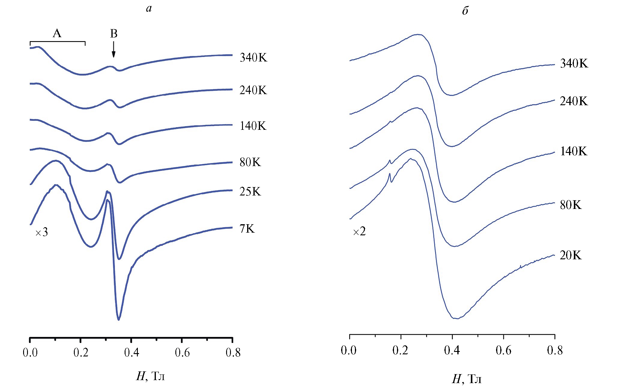 Спектры ЭПР порошковых образцов записаны в стационарном режиме (CW) на спектрометре Bruker EMXplus (X-диапазон) с гелиевой приставкой ER4112HV и цифровой системой контроля температуры ER4131VT. Микроволновая мощность выбиралась таким образом, чтобы насыщение не происходило во всем исследованном диапазоне температур 4—340 K. Моделирование ЭПР-спектров проведено с использованием пакета программ EasySpin [20].