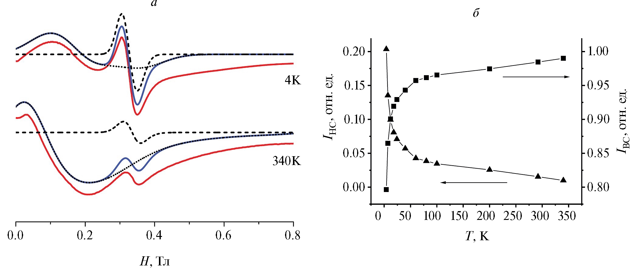 Следует отметить, что сигнал НС комплексов имеет слабую анизотропию и линии недостаточно разрешены, что не позволяет с большей точностью определить индивидуальные параметры комплексов, gср = 2.015—2.040. Линия от ВС центров Fe(III) соответствует комплексам с параметрами тонкой структуры D >> hν, E/D << 1/3, причем при T < 12 K сигнал хорошо описывается с D = 40 ГГц и E/D ≈ 0.095. При более высоких температурах наряду с этой линией появляется и растет по интенсивности сигнал с E = 0, при Т > 80 К сигнал ВС комплексов уширяется и сдвигается в сторону низких полей. Уширение и сдвиг линии может быть связан с ускорением релаксационных процессов и увеличением внутреннего магнитного поля, воздействующего на ионы Fe(III) с ростом температуры [23].