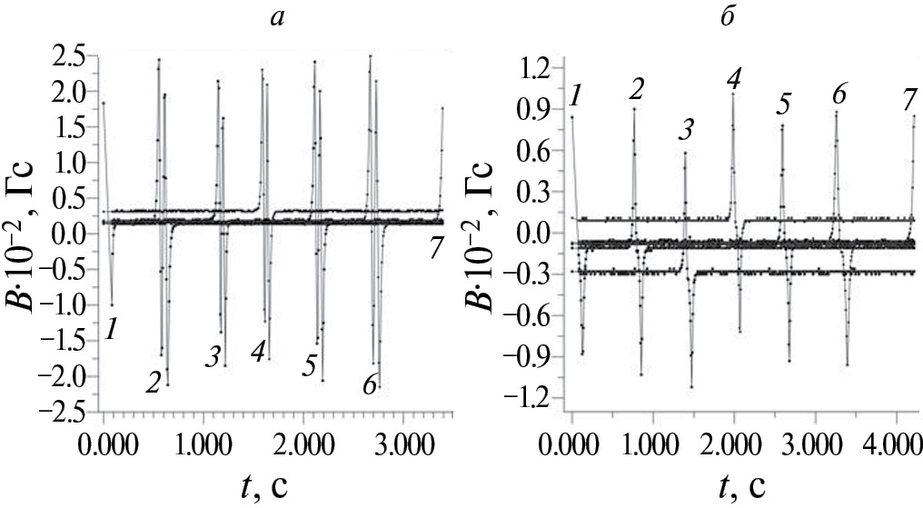 Рис. 4. Осциллограмма сигнала B(t) с датчиков Холла в опыте с магнитным телом (рис. 2в) (а), покрытого МЖ № 1; то же в опыте с телом (рис. 2г) (б).