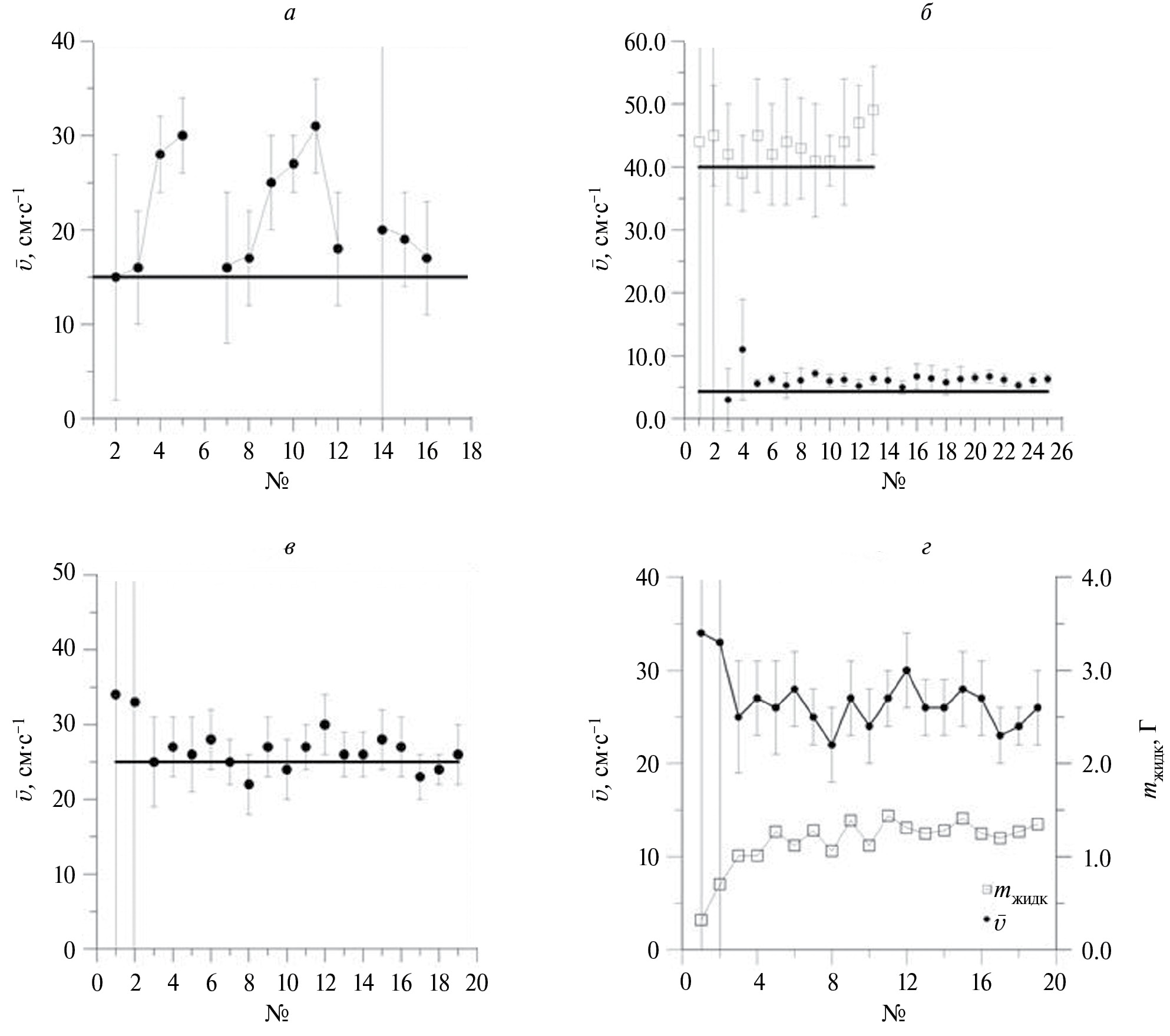 Рис. 6. Лабораторные измерения средней скорости падения магнитных тел из двух дисковых магнитов с немагнитной вставкой (рис. 2б), покрытого МЖ № 1 (а); тела из двух цилиндрических магнитов с алюминиевой вставкой (рис. 2в) покрытого МЖ № 1 и 2 (б); тела из 16 кольцевых магнитов с немагнитными вставками (рис. 2г), покрытого МЖ № 1 (в). Доверительные интервалы соответствуют среднеквадратичному отклонению скорости δυ. Горизонтальная прямая — расчет по формуле (13). Средняя скорость движения и масса слоя МЖ в трубке в зависимости от количества проведенных опытов (г).