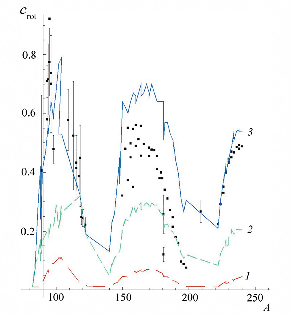 Рис. 2. Экспериментальные (квадраты) и теоретические моменты инерции crot, нормированные на твердотельные значения, в зависимости от массового числа. Расчеты теоретических значений проведены в рамках гидродинамической (1) и сверхтекучих моделей с осцилляторным потенциалом (2) и потенциалом прямоугольной ямы (3).