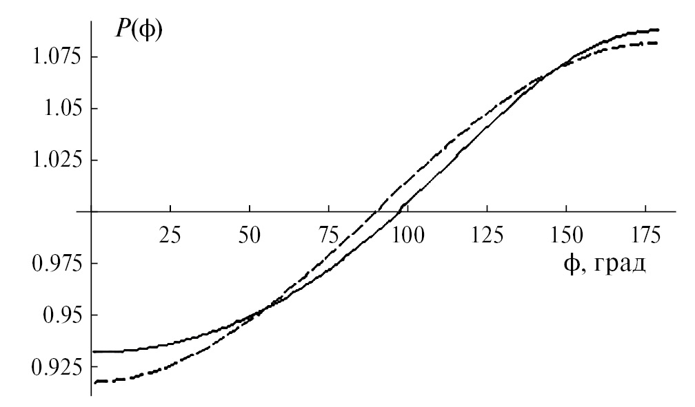 Рис. 2. Сравнение с результатами [2]. Сплошная линия — распределение в рамках настоящей работы; пунктирная линия — распределение в рамках работы [2] для .