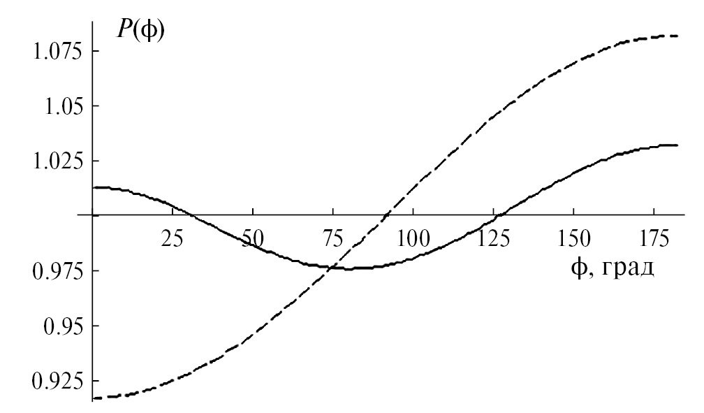 Таким образом, нами были рассмотрены разные теоретические подходы к изучению корреляций углов между спинами фрагментов двойного деления ядер. Определены основные особенности и различия работ [2, 3, 23—25]. Построены угловые корреляции для распределения (3) с учетом следующих теоретических положений: двумерность спинов фрагментов, перпендикулярность спина делящегося ядра, холодность ядра на протяжении всего процесса деления, использование нулевых wriggling- и bending-колебаний для распределения (3).