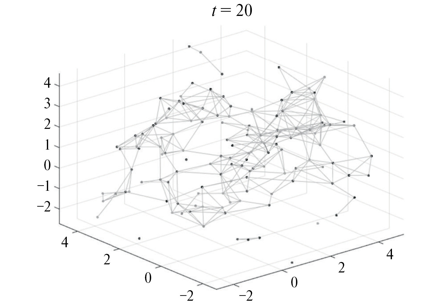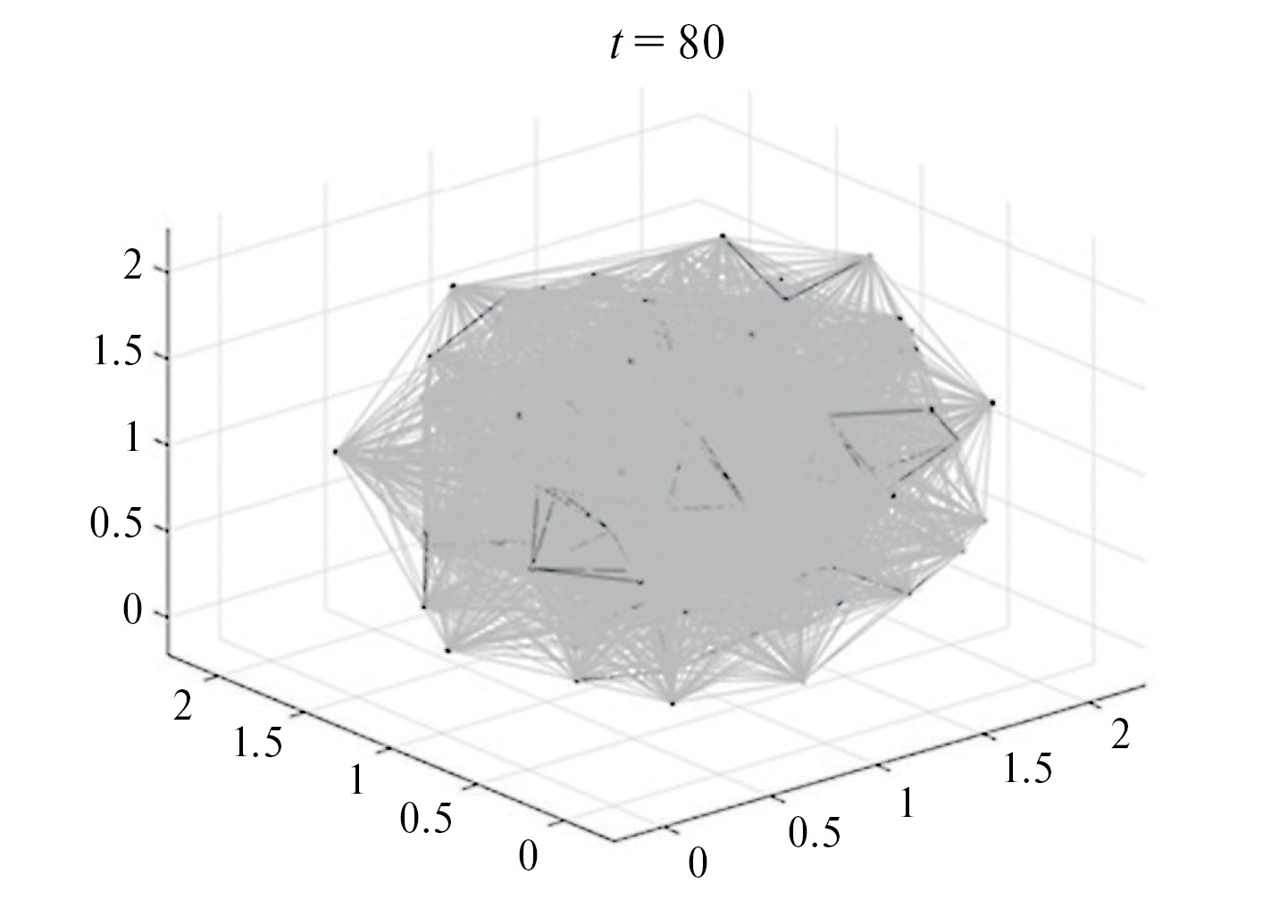 Рисунки 1 и 2 иллюстрируют состояние системы частиц в моменты t = 20 и t = 80. Вершины-точки соответствуют позициям частиц в пространстве, ребра светлого оттенка обозначают наличие притяжения между частицами, темные ребра — отталкивание. С течением времени кластерная структура системы частиц меняется под воздействием притяжения и отталкивания между частицами. В момент t = 20 наблюдается сравнительно малое число межчастичных взаимодействий, что обусловлено сравнительно большим средним расстоянием между каждой парой частиц. К моменту t = 80 произошло сближение частиц, что привело к образованию большого числа взаимодействий в силу попадания большего количества частиц в области притяжения и отталкивания соседних частиц. При этом общий объем, занимаемый всей системой, уменьшился, что отражено в изменении масштаба осей координат на рис. 1 и 2. При относительно малой величине внешнего возмущения состояние системы изменяется в сторону меньшего числа кластеров, при этом размер кластеров увеличивается.