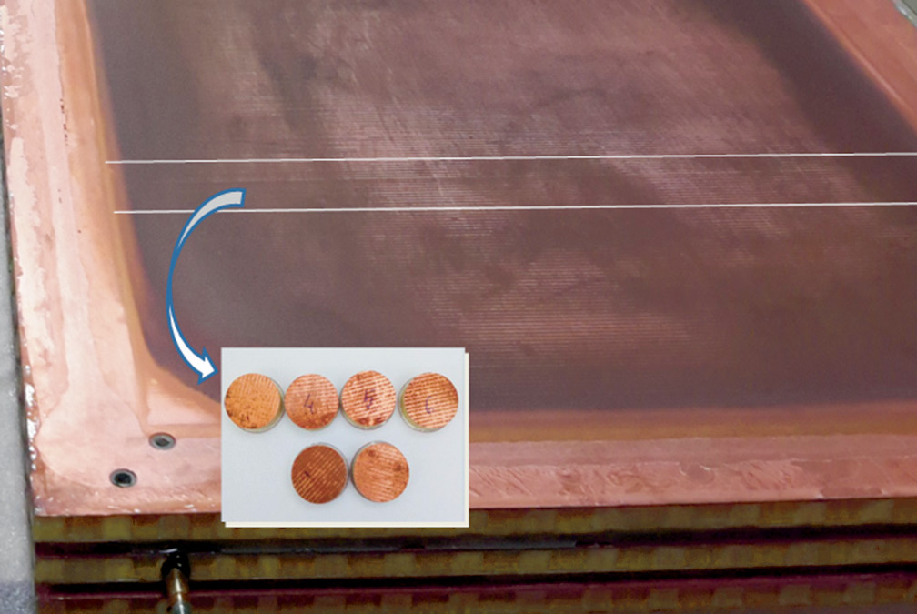 На рис. 1 показана катодная плоскость после полной разборки детектора. Практически вся поверхность выглядит окисленной. Видно, что осаждение из газовой смеси на катод происходит в электрическом поле непосредственно вдоль анодных проволочек, образуя черные полосы на поверхности медной фольги. Размытие осадков по краям катодной рамы, видимо, связано с турбулентностью прохождения газовой смеси в зазоре МПК — 5 мм. Зона, выделенная двумя белыми линиями, является областью предположительного нахождения точки эмиссии. Здесь спонтанный ток с катода над полосой из восьми анодных проволочек вызвал аномально большое число срабатываний. В этой зоне для исследования с поверхности катода были вырезаны диски диаметром 23 мм (рис. 1, вставка внизу). Несколько образцов было взято также и на удалении ~ 20 см от выделенной полосы.