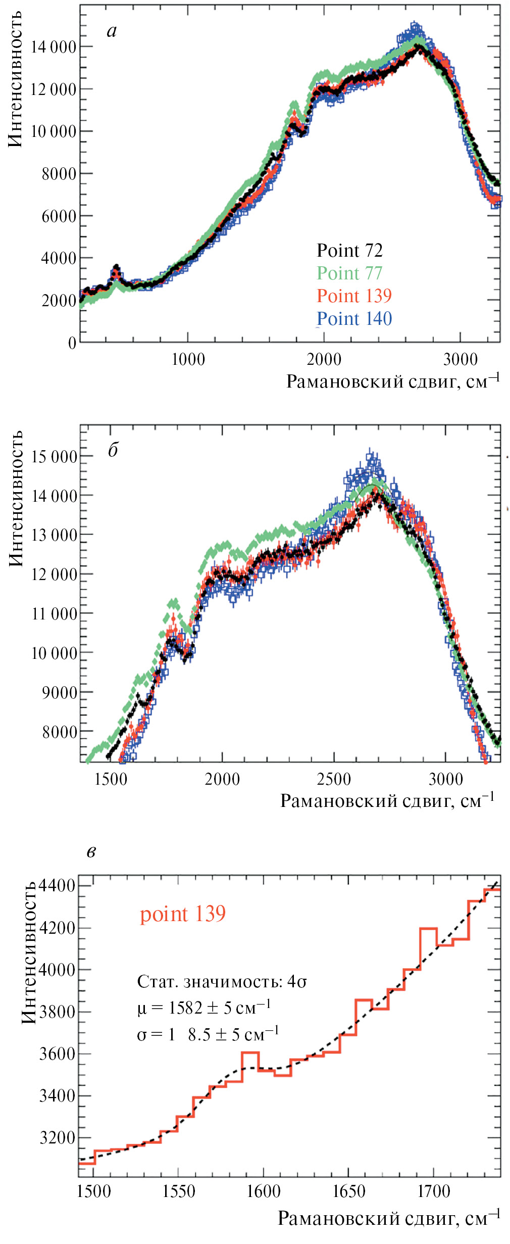 Рис. 2. КР-спектры в различных точках поверхности катодных образцов: а — КР-спектры в диапазоне 0—3200 см-1, где обнаружены наноуглеродные структуры, указывающие на наличие эмиссионных центров; б — те же КР-спектры в диапазоне 1400—3200 см-1; в — КР-спектр в точке (point 139), где с достоверностью 4s выделен G-пик — 1582 см-1.