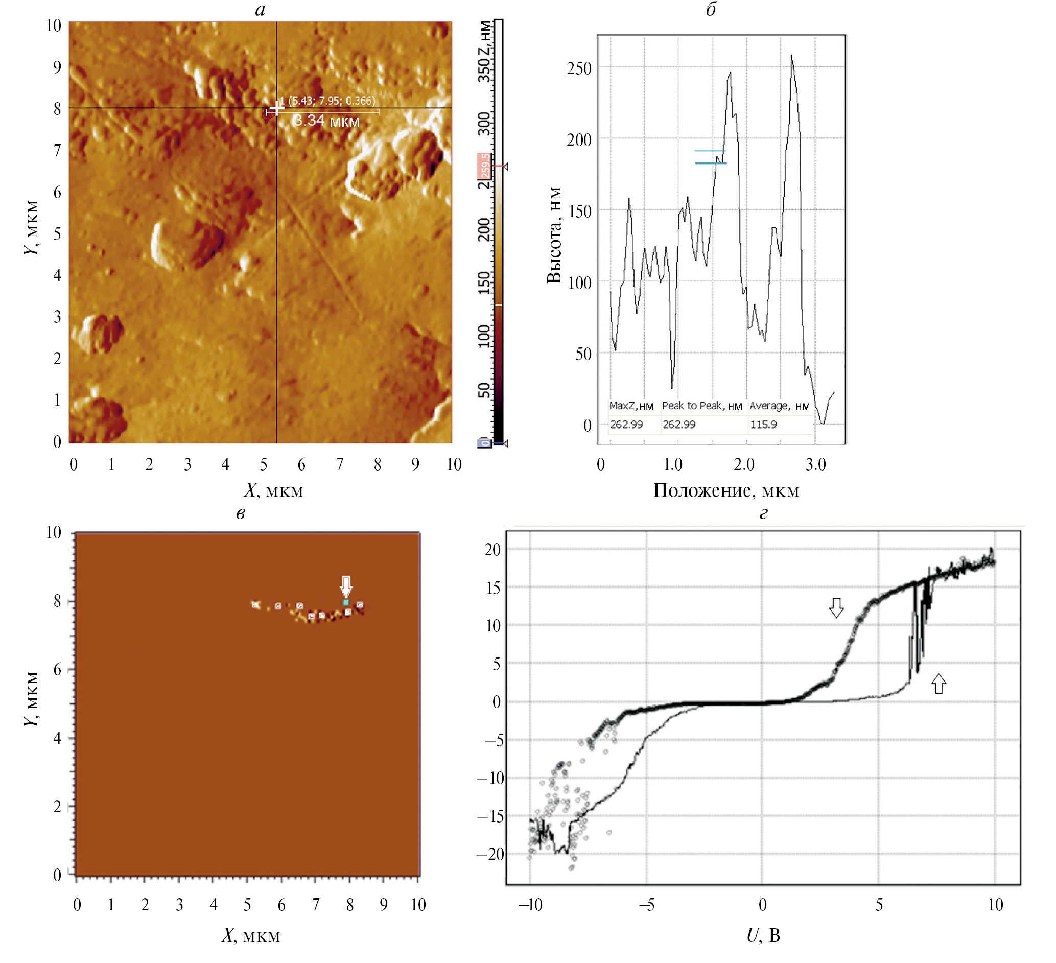 Рис. 3. АСМ скан (10×10 мкм) поверхности в зоне эмиссии, перекрестием отмечена область эмиссии (а); профиль поверхности в области эмиссии, стрелка обозначает положение обнаруженного эмиссионного образования (б); токи растекания в зоне эмиссии (в), стрелкой показана точка, где обнаружен резистивный сдвиг ВАХ; две кривые ВАХ в диапазоне напряжения от –10 В до +10 В (г): нижняя кривая — рост U, верхняя кривая — уменьшение U. В диапазоне U ~ 2—7 В виден биполярный резистивный сдвиг и пики отрицательного дифференциального сопротивления.
