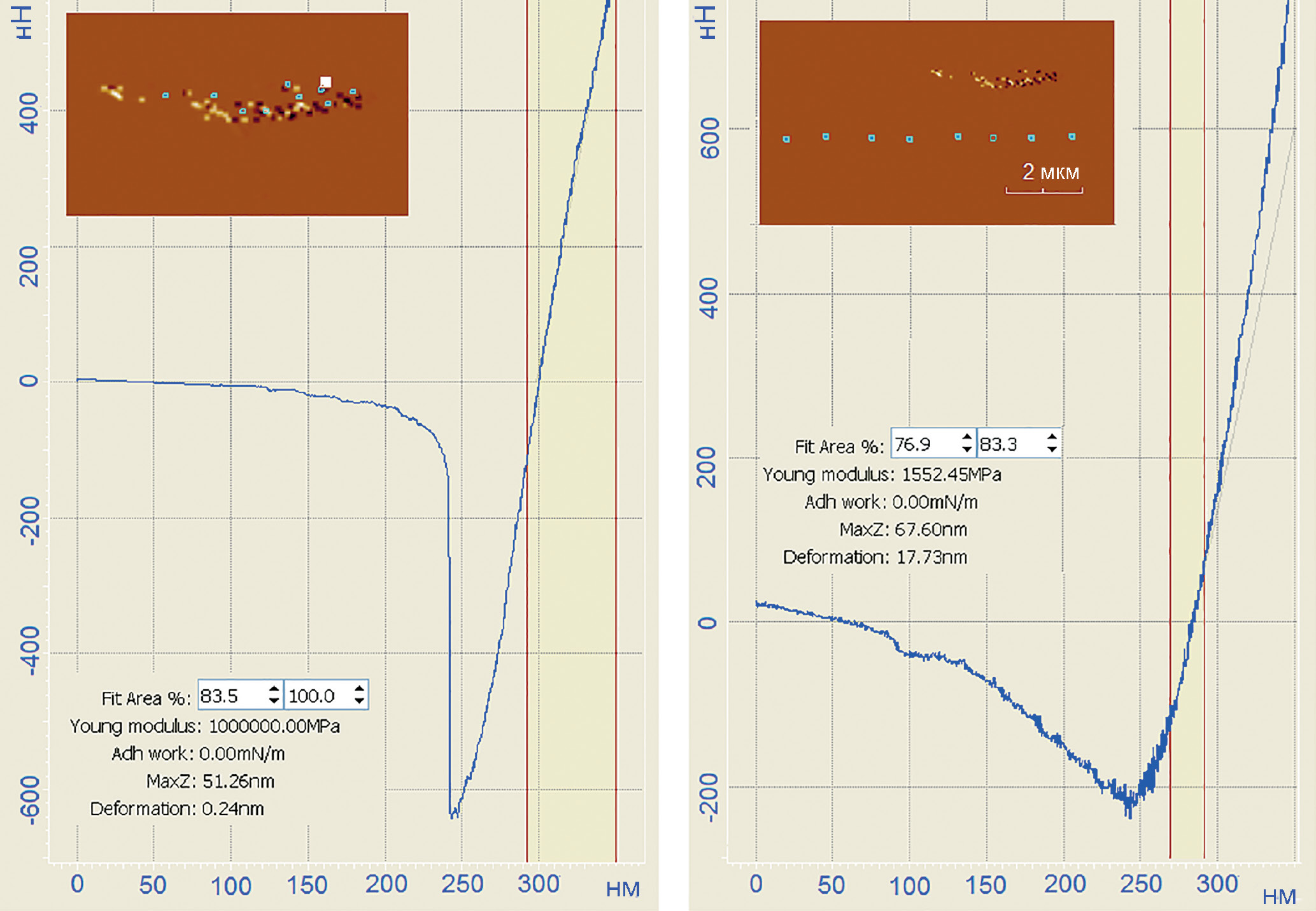 Рис. 4. Силовые кривые, измеренные в разных точках. Слева: силовая кривая в точке (вставка — белый квадрат) в области повышенных токов растекания. Модуль Юнга — 1012 Па. Справа: типичная силовая кривая для точек (вставка — синие квадраты), удаленных от области повышенных токов индукции. Модуль Юнга в этих точках ~ 1.55·109 Па.