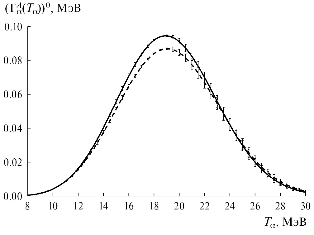 Рис. 1. Ширина вылета α-частиц из шейки предразрывной конфигурации делящегося ядра 252Cf, где штриховая линия — (s, f), сплошная линия — (nth, f).