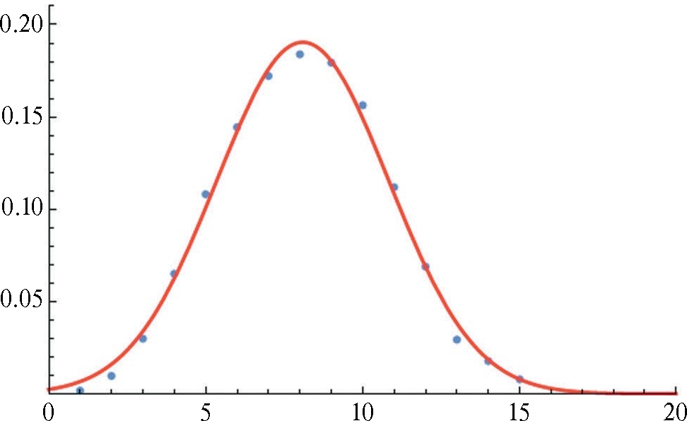 Рис. 2. Отклик калориметра на 2 протона в одном событии с учетом функции отклика калориметра рис. 1. Точки — расчетные значения. Плавная кривая — аппроксимация расчетных значений гауссовой кривой.