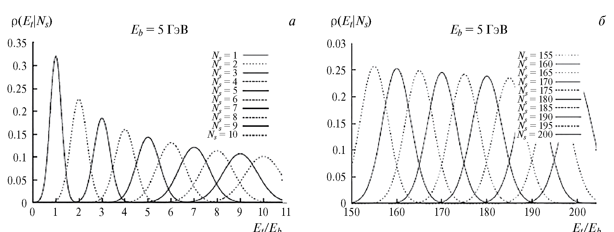 Рис. 3. Плотность вероятности получить отклика калориметра Et, когда через него проходит Ns нуклонов-спектаторов, как функция величины Et / Eb. Eb — энергия одного спектаторного нуклона: малое число нуклонов-спектаторов Ns (а), большое число нуклонов-спектаторов Ns (б).