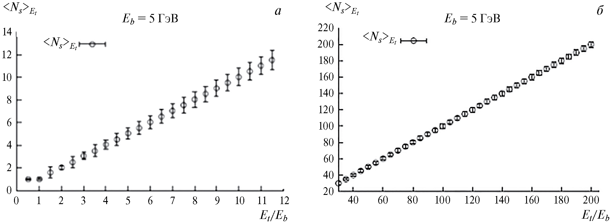 Рис. 4. Среднее число протонов Ns при измеренном отклике калориметра Et, рассчитанное по формуле (4) с использованием в качестве P(Ns) распределения Пуассона с математическим ожиданием Ns = Et / Eb: для зарегистрированной энергии Et / Eb < 12 (а), Et / Eb > 30 (б).