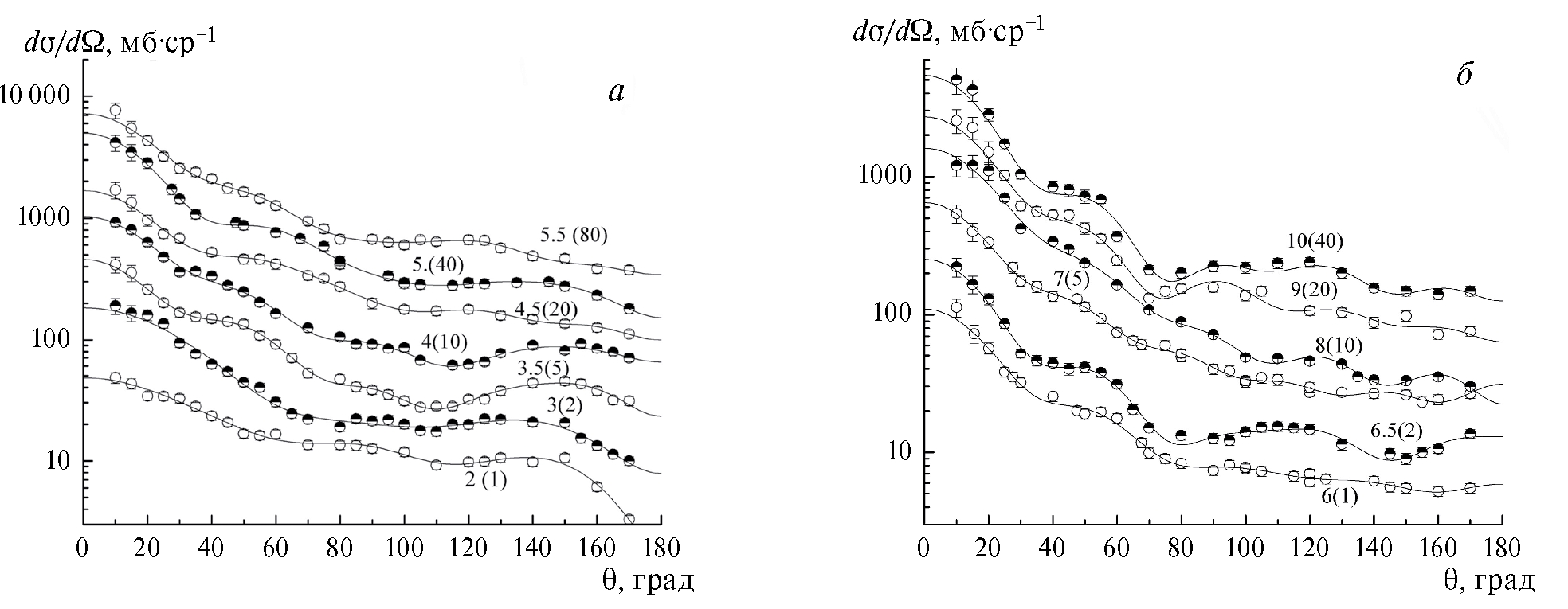 Дифференциальные сечения и их описание приведены на рис. 6. Систематическая погрешность (5.3 %) данных равна погрешности в измерении дейтронного потока (2 %) и толщины мишени (5 %). Случайные погрешности конечных результатов составили 8 %. Они складываются из случайных погрешностей величин, определяющих дифференциальные сечения, погрешности в установке углов, неравномерности по толщине мишеней в неявном виде (через процедуру усреднения результатов, полученных в различных сериях измерений). Для удобства наблюдения дифференциальные сечения умножены на числа, которые указаны в круглых скобках рядом со значениями Еd.