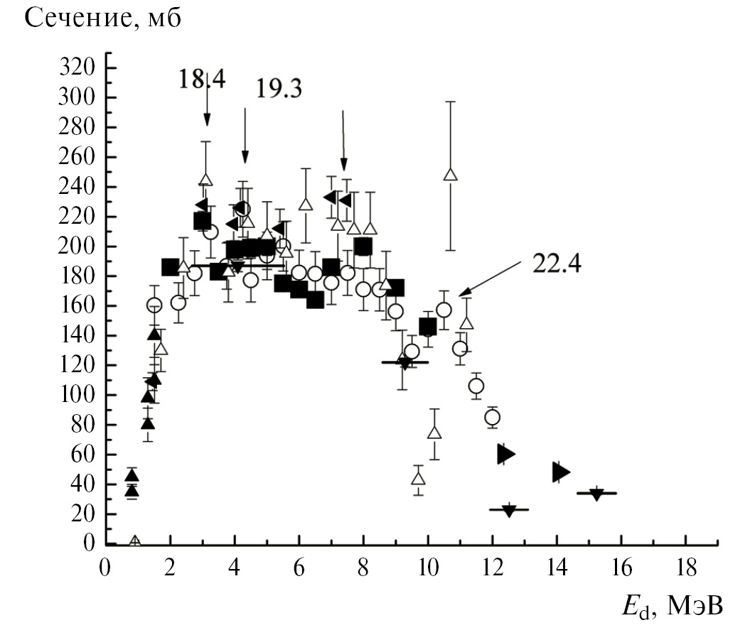 Рис. 8. Полные сечения реакции 9Be(d, xt) (○ — данные настоящих активационных измерений; ■ — данные настоящих спектрометрических измерений; ◄ — [2]; ▼ — [4]; ▲ — [8]; Δ — [9]; ► — сумма сечений [18] каналов 1, 2, 4 реакции (табл. 1); стрелками отмечены возможные резонансы).