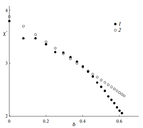 При последовательном увеличении объемного содержания немагнитного наполнителя, с одной стороны, площадь межфазной поверхности увеличивается, а с другой стороны, уменьшается расстояние между частицами магнетита и твердой поверхностью, и все большее количество магнитных частиц оказывается подвержено действию поверхностных сил. В результате их время релаксации увеличивается, что должно приводить к уменьшению магнитной восприимчивости. При малых объемных концентрациях немагнитного наполнителя эти эффекты практически не оказывают влияния на величину магнитной восприимчивости. Однако, начиная с определенного значения объемной концентрации наполнителя (δ ~ 0.5), они становятся существенными и определяют уменьшение восприимчивости.