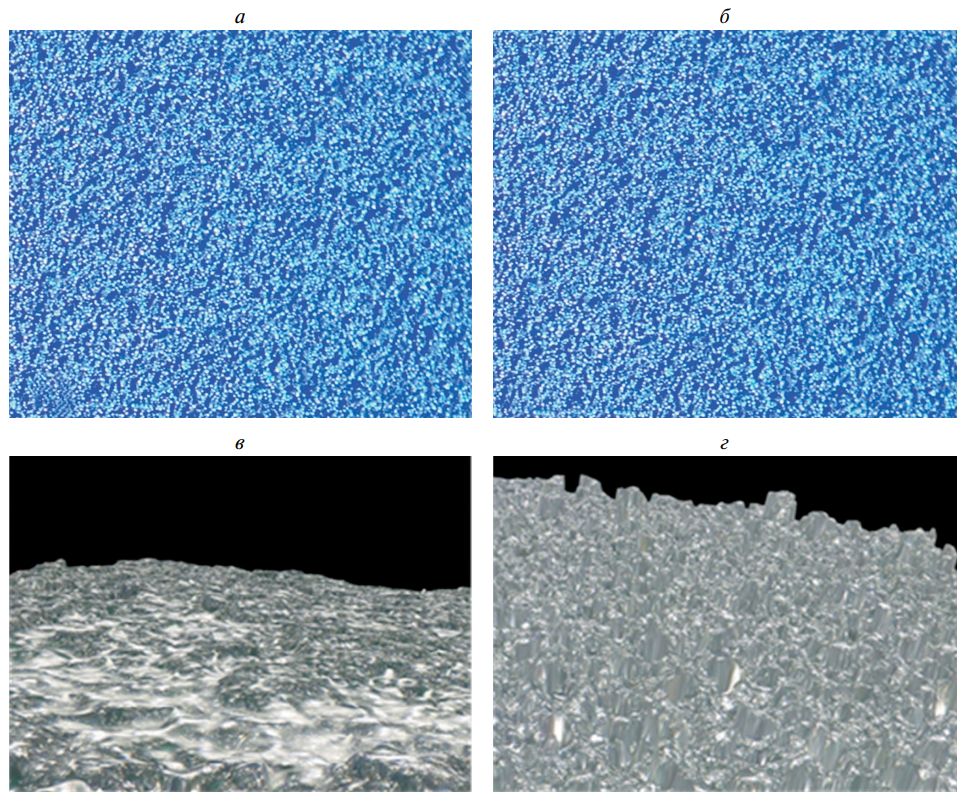 Рис. 3. Изменение структуры поверхности под действием магнитного поля. Условное увеличение ×10. Масштаб двух картинок одинаков. Исходный (а) и в магнитном поле 100 мТл (б). Фотография 3D профиля поверхности образца МАЭ без магнитного поля (в) и в магнитном поле 200 мТл (г). Увеличение ×500.