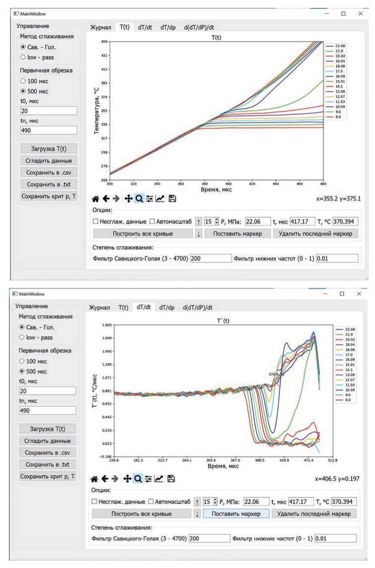 4. Fig. 3. Software graphical interface for determining FD (lines of achievable superheating and critical parameters) using water as an example: initial thermogram data (top), values of their time derivatives (bottom).