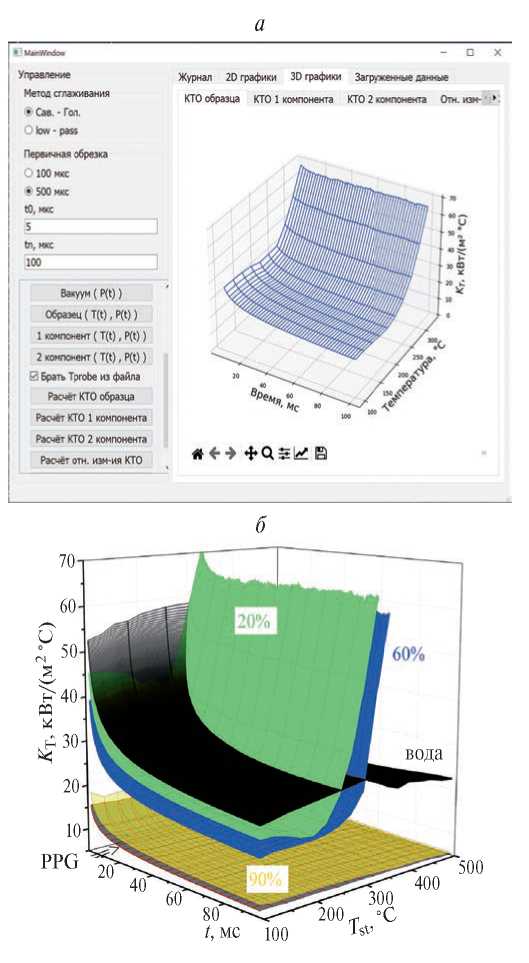 Рис. 4. Мгновенный коэффициент теплоотдачи в водный раствор полипропиленгликоля (PPG): (а) графический интерфейс ПО, пример определения КТО в водный раствор с 20 мас. % PPG; (б) сопоставление КТО в исходные компоненты водного раствора PPG и в образцы (числа соответствуют мас. % содержанию PPG в воде).
