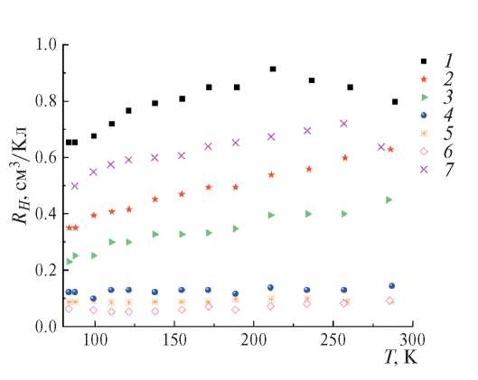Рис. 2. Температурные зависимости коэффициента Холла кристаллов: 1 – Bi2Te3; 2 – Bi1.5Sb0.5Te3; 3 – Bi1.2Sb0.8Te3; 4 – Bi0.8Sb1.2Te3; 5 – Bi0.4Sb1.6Te3; 6 – Bi0.01Sb1.99Te3; 7 – Bi1.8Sb0.2Te3.