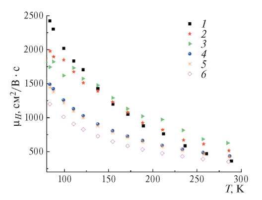 Рис. 3. Температурные зависимости холловской подвижности кристаллов: 1 – Bi2Te3; 2 – Bi1.5Sb0.5Te3; 3 – Bi1.2Sb0.8Te3; 4 – Bi0.8Sb1.2Te3; 5 – Bi0.4Sb1.6Te3; 6 – Bi0.01Sb1.99Te3.