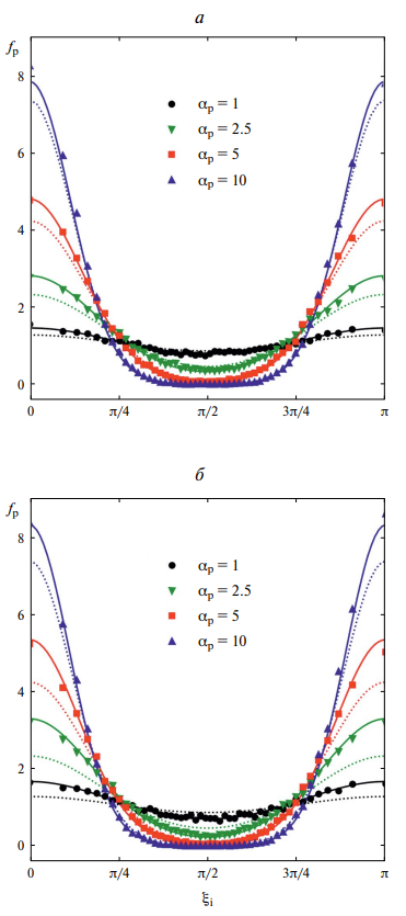Рис. 1. Плотность распределения fp легких осей намагничивания по углу ξi для текстурированного феррокомпозита с объемной долей частиц φ = 0.125 и параметром σp = 15 для различных значений поля полимеризации αp = 1 (черные круги), 2.5 (зеленые треугольники), 5 (красные квадраты), 10 (синие треугольники): (a) χL = 1, λp = 1; (б) χL = 2, λp = 2. Символами отмечены результаты компьютерного Монте—Карло моделирования, пунктирные кривые соответствуют случаю невзаимодействующих частиц, сплошными кривыми показаны предсказания настоящей теории (9).