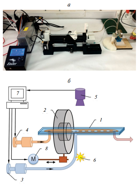 Рис. 1. Экспериментальная установка: внешний вид (а); блок-схема (б): 1 — микрофлюидное устройство, 2 — кольцевой постоянный магнит, 3,4 — шприцевой насос, 5 — цифровой микроскоп, 6 — осветитель, 7 — компьютер, 8 — мехатронный привод.