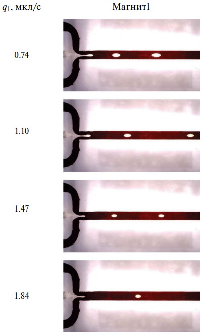 Рис. 5. Динамика капель минерального масла в образце магнитной жидкости МЖ-1 при различных скоростях подачи непрерывной фазы q1 под действием магнитного поля кольцевого Магнита1, находящегося в нулевом положении относительно разъема подачи дисперсной фазы в микроканал.