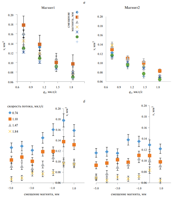 На рис. 6 представлены зависимости объема капель минерального масла от скорости подачи образца магнитной жидкости МЖ-1 и горизонтального смещения кольцевых магнитов вдоль оси микроканала.