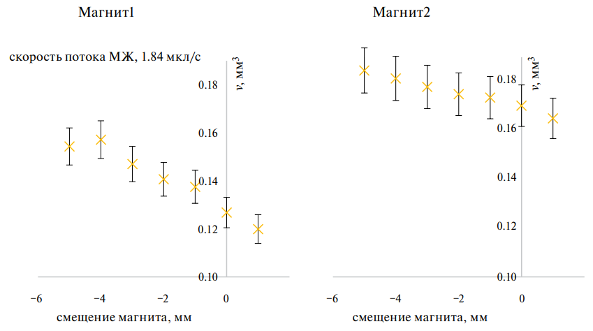 Наибольший объем дисперсий масла для Магнита2 достигается при его положении –1 мм. В данном случае область с максимальным значением напряженности магнитного поля располагается на 1 мм ближе к зоне введения дисперсной фазы, чем в случае использования Магнита1. Последующее перемещение магнита влево или вправо снижает размер немагнитных включений.