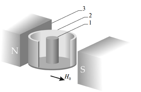 Рис. 1. Схема экспериментальной установки: 1 — магнитное тело, 2 — кювета, заполняемая магнитной жидкостью, 3 — полюса электромагнита.