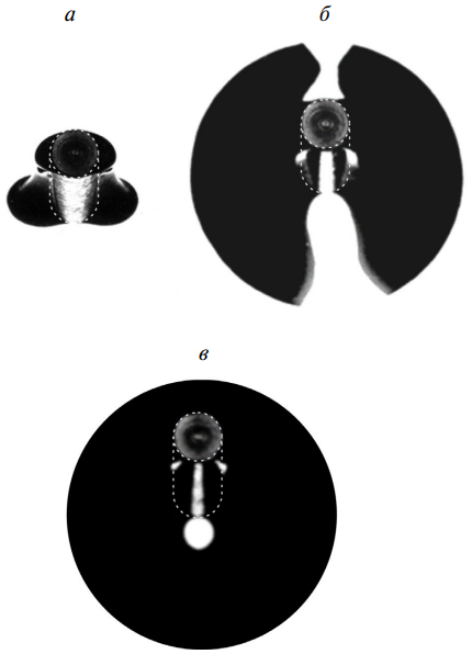 На рис. 2а, представлена фотография (вид сбоку) цилиндрического образца, окруженного малым (0.8 см3) объемом магнитной жидкости при напряженности внешнего магнитного поля H0 = 79.6 кA/м. Вектор магнитного поля на рис. 2а направлен слева направо. Пунктиром на рисунке изображено положение магнитного цилиндра, темная область пространства вокруг него занята магнитной жидкостью, светлая область пространства свободна от магнитной жидкости. На рис. 2б представлена фотография распределения магнитной жидкости объемом 44 см3 вокруг цилиндра. На фотографиях видно, что малый объем магнитной жидкости располагается вдоль участков поверхности цилиндра, где угол между направлением магнитного поля и нормалью к поверхности цилиндра близок к 0 или 180° (левая и правая части цилиндрического образца на рис. 2). Участки поверхности цилиндра, свободные от магнитной жидкости, сужаются в направлении силы тяжести. При этом магнитная жидкость располагается по высоте цилиндра так, что сечение ее объема плоскостью, перпендикулярной оси цилиндра, увеличивается в направлении силы тяжести.
