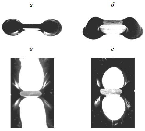 В условиях эксперимента, описанного ранее в случае цилиндра и шара, были исследованы фигуры равновесия магнитной жидкости в окрестности намагничивающейся пластины. На рис. 4а и 4б показаны фотографии короткой пластины (вид сверху — рис. 4а, вид сбоку — рис. 4б), окруженной малым объемом магнитной жидкости 2.3 см3. Видно, что малый объем магнитной жидкости скапливается у торцов пластины в виде капель. Видно также некоторое натекание жидкости на верхнюю грань пластины. Горизонтальное сечение свободной поверхности магнитной жидкости вблизи боковых концов пластины (рис. 4а) имеет форму эллипсов с большой осью, направленной вдоль магнитного поля. Каплевидные образования магнитной жидкости на концах пластины расширяются в направлении силы тяжести. Магнитная жидкость начинает растекаться по дну кюветы в виде областей эллиптической формы (рис. 4б). На рис. 4в приведена фотография пластины, окруженной магнитной жидкостью с суммарным объемом 86 см3. При таком объеме магнитная жидкость на дне кюветы слева и справа от пластины растекаются до границ кюветы, оставляя зоны эллиптической формы, свободные от магнитной жидкости. Это светлые области в верхней и нижней частях фотографии. С увеличением суммарного объема магнитной жидкости в кювете до 106 см3 (рис. 4г) на дне кюветы левый и правый объемы жидкости соединяются. При этом в результирующем объеме магнитной жидкости в окрестности центральной части пластины образуются две воздушные полости, по одной на каждой стороне пластины. В эксперименте видно, что образовавшиеся воздушные полости имеют форму конусообразных воронок, сужающихся в направлении силы тяжести от верхней свободной поверхности магнитной жидкости до дна кюветы.