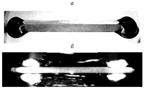На рис. 5а приведена фотография длинной пластины, окруженной малым суммарным объемом (3 см3) магнитной жидкости (вид сбоку). Магнитная жидкость, как и в случае короткой пластины, собирается у торцов пластины, растекаясь по всей ее высоте. При доведении суммарного объема магнитной жидкости до 73 см3 (рис. 5б) жидкость касается центральной части поверхности пластины. При этом в окрестности торцов пластины формируются четыре воздушные полости — по две на каждую сторону пластины. Полости имеют вид конусообразных воронок, сужающихся в направлении силы тяжести от верхней границы магнитной жидкости до дна кюветы. Описанные эксперименты показывают, что характер распределения магнитной жидкости вблизи поверхности пластины существенно зависит от размеров пластины.