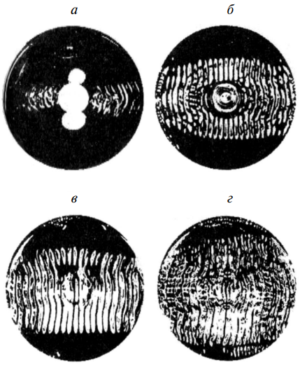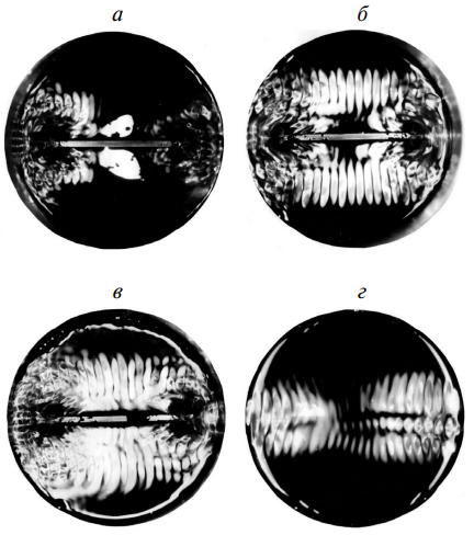 Результаты экспериментов представлены на следующих рисунках. На рис. 6а-6г представлены динамические структуры поверхности магнитной жидкости, полученные вблизи вертикального намагничивавшегося цилиндра. На рис. 7а-7г показаны динамические структуры поверхности магнитной жидкости, полученные вблизи шара. На рис. 8а-8г — динамические структуры, полученные вблизи пластины. В центре рисунков виден образец. На рис. 6—8 буквами от а до г помечены фотографии динамических структур поверхности магнитной жидкости, полученные при различных объемах магнитной жидкости в кювете: — 10.9 (а); 31.3(б); 51.3 (в); 171.3 см3 (г). В случае, когда магнитная жидкость полностью покрывает магнитное тело, дальнейшее увеличение объема магнитной жидкости в кювете приводит к тому, что амплитуда волновых возмущений сводной поверхности начинает убывать.
