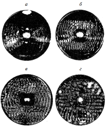 Наблюдения показали, что дальнейшее увеличение объема магнитной жидкости в кювете приводит к сужению просвета полости в придонной части кюветы и увеличению высоты уровня жидкости в областях, удаленных от цилиндра. Существует некоторое критическое значение объема жидкости, при котором белые пятна, изображенные на рис. 2в, исчезают. При этом воздушные полости принимают вид расширяющихся снизу вверх воронок конусообразной формы с вершинами на дне кюветы. Еще большее увеличение объема жидкости приводит к их вырождению. С увеличением напряженности магнитного поля воронки вновь возникают и их объем возрастает с увеличением интенсивности поля.