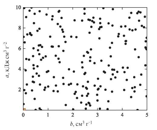 В последнее время предлагаются различные способы обработки и анализа экспериментальной информации [32, 33]. В настоящей работе предлагается способ оптимизации описания данных по изобарическому расширению жидкого металла с помощью метода роя частиц, представляющего собой стохастический алгоритм, в основе которого лежит использование набора элементов (частиц). Каждая частица является вектором в некотором многомерном пространстве решений, координаты которого в начальный момент задаются случайным образом. Крайне желательно, однако, чтобы частицы исходно были равномерно распределены по исследуемой области пространства [1]. Это можно обеспечить, например, путем задания достаточно большого количества элементов роя. Есть и другие способы, связанные с некоторой упорядоченностью задания начального положения [34]. В настоящей работе исходные координаты каждой частицы определяются полностью случайным образом.