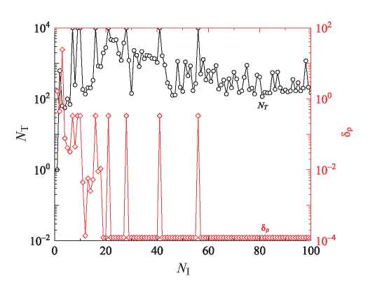Рис. 2. Число итераций NT (за время работы алгоритма) и достигаемое наименьшее отклонения от экспериментальных данных δρ (5) в зависимости от числа частиц NI. По оси абсцисс отложено число частиц NI.