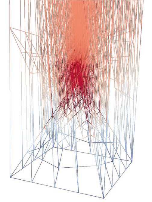Рис. 1. Расчетная сетка конечных элементов для пирамид размером 𝑙R = ℎR = 1 мкм. Цветом показано распределение коэффициента усиления электрического поля .