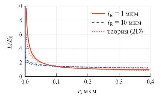 На рис. 2 показана зависимость коэффициента усиления электрического поля 𝐸(𝑟)/𝐸0 от расстояния до острия пирамиды. Высота пирамиды была взята равной ℎR = 1 мкм. Видно, что для острой пирамиды с узким основанием 𝑙R = 1 мкм поле вблизи острия гораздо сильнее, чем для пологой пирамиды с основанием 𝑙R = 10 мкм. Так, на расстоянии 0.025 мкм усиление примерно в 3 и в 1.9 раза соответственно. На расстоянии 0.1 мкм в обоих случаях усиление примерно в 1.5 раза. Пунктирной линии соответствует формула (1), можно заметить, что качественно эффект в двумерном и трехмерном случаях не отличается.
