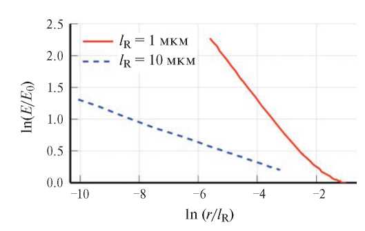 На рис. 3 показан тот же график в двойном логарифмическом масштабе (расстояние 𝑟 нормировано на ширину основания 𝑙R ). Видно, что в обоих случаях зависимость может быть фитирована степенным законом с 𝛼 ≈ 0.5 и 0.2 соответственно. Этот результат согласуется с анализом уравнения Лапласа в схожих граничных условиях (с конусом вместо пирамиды) [35], однако показатель степени 𝛼 оценен ранее не был. Кроме того, в [35] рассматривался единичный конус, а не периодическая система, как в нашем случае.