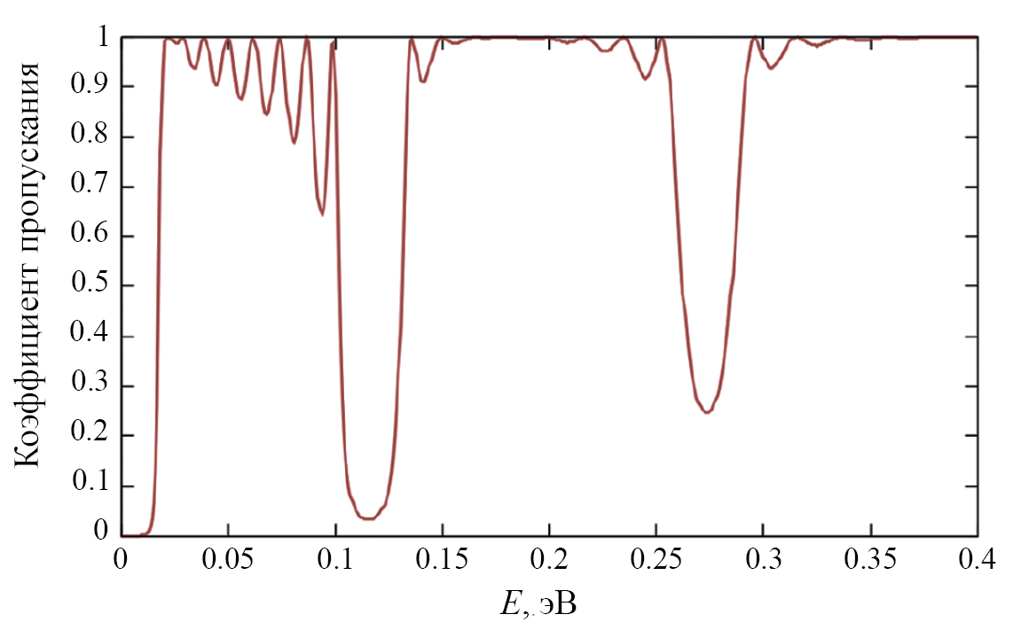 На рис. 3 приведена расчетная зависимость коэффициента прохождения от энергии E для периодической потенциальной ямы U(x)